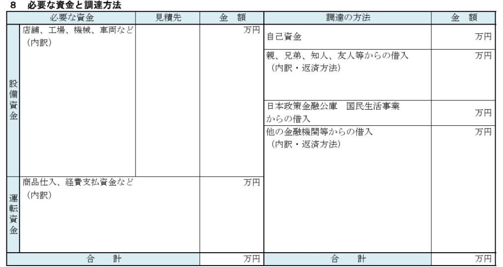 を明確に示します。スモールビジネスでは、ここの「自己資金」の欄が特に重視されます。
