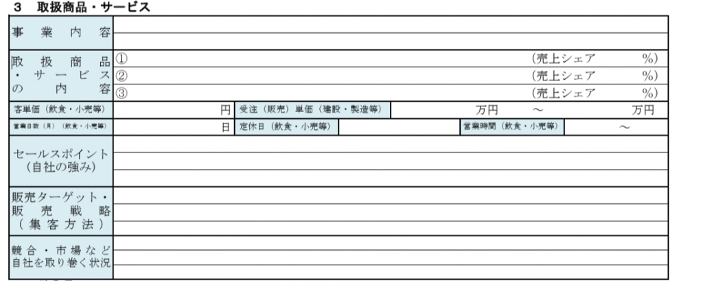 特に日本政策金融公庫の創業計画書「3. 取扱商品・サービス」の欄は、
