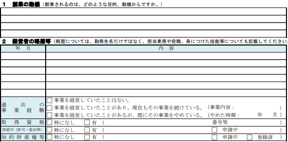【日本政策金融公庫の創業計画書「1. 創業の動機」と「2.経営者の略歴等」】